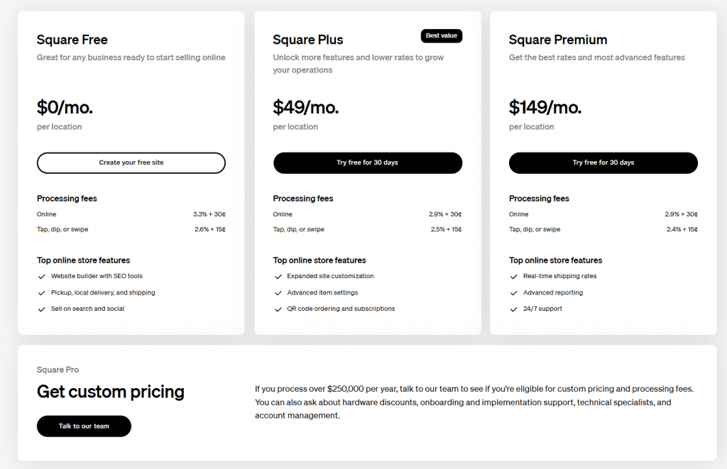 Compared to Squarespace, Square Online’s drag-and-drop editor is more basic and easier for a new user to navigate, while Squarespace’s Fluid Engine technology provides sophisticated design control. Square Online also offers a forever-free plan, which is not available on Squarespace.