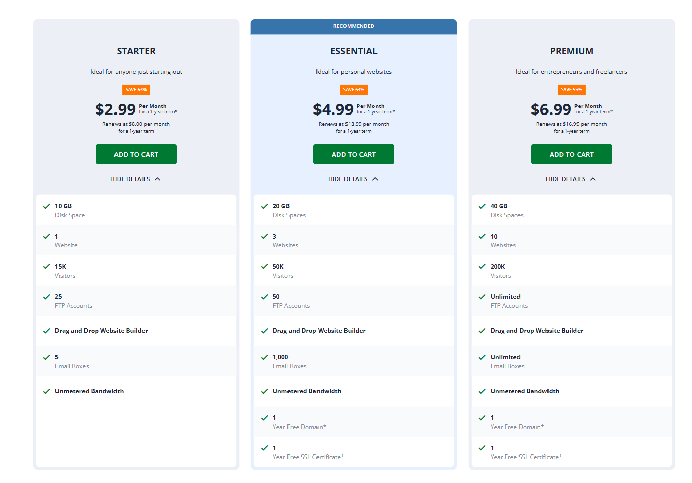 Network Solutions offers three paid plans to cater to each need. Each plan includes access to essential features, the AI website builder, and expert support. The complete tiers for their web hosting plans are as follows: