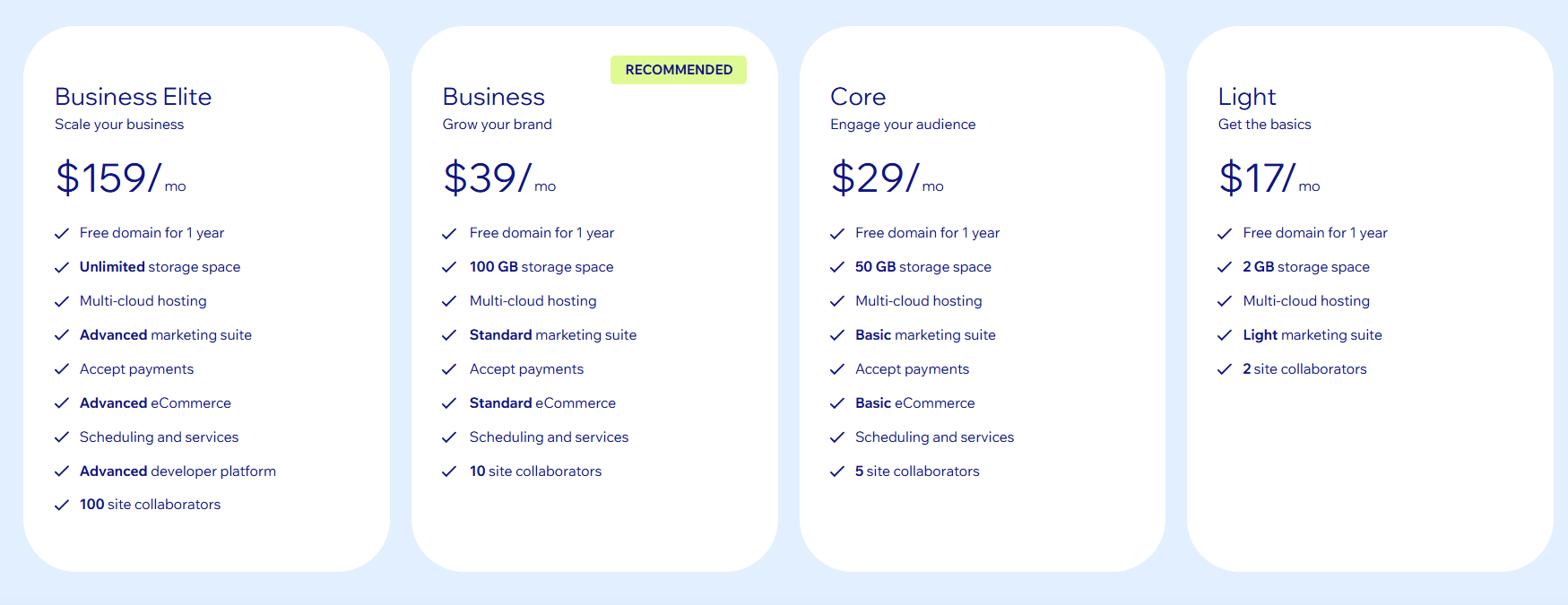 In addition to their free plan, Wix’s pricing plans have four tiers: Light, Core, Business, and Business Lite. All plans include custom domain, reliable web hosting, AI powered web creation tools, and 24/7 customer support. Their paid tiers include: