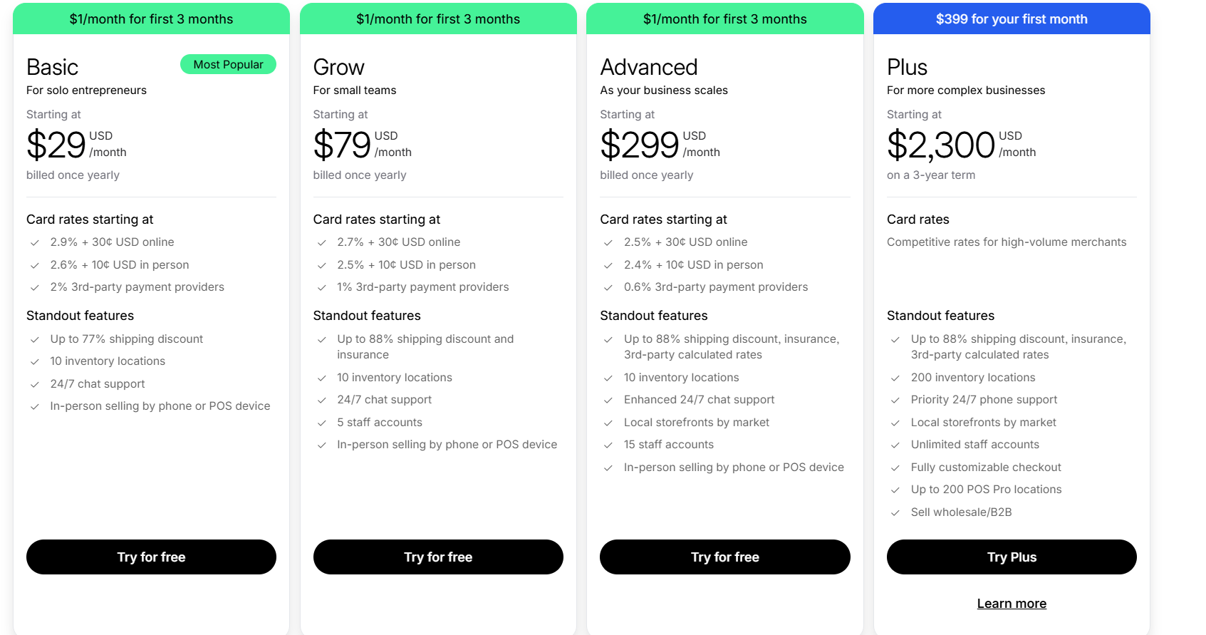 Shopify offers $1 monthly for Basic, Grow, and Advanced plans for the first three months. They also have a free trial available. The complete price list and their respective inclusions are the following: