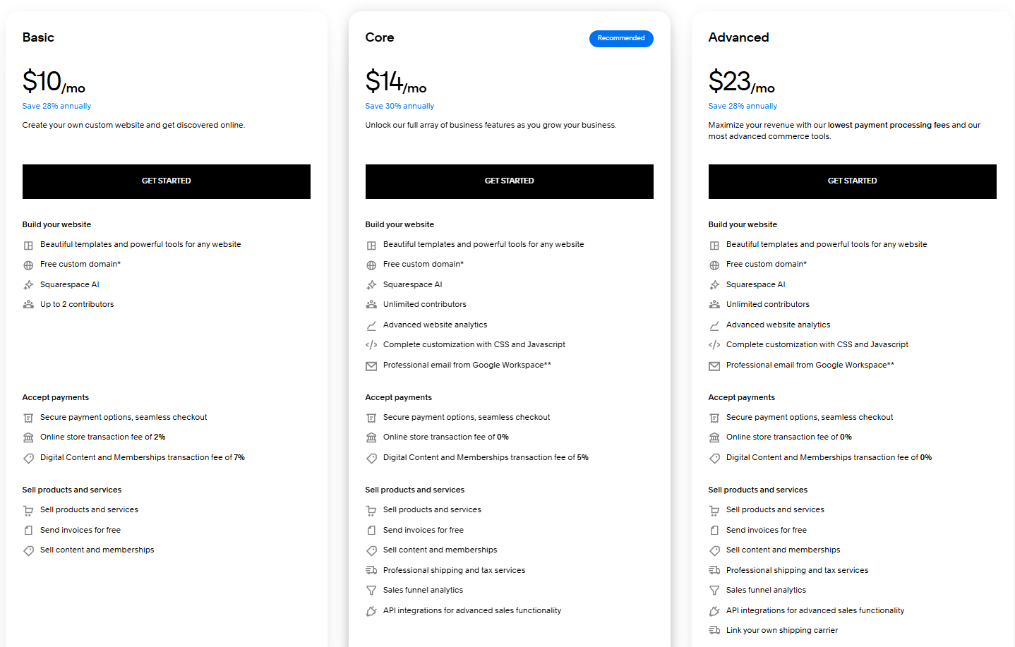 Here are the pricing details as published on Squarespace: