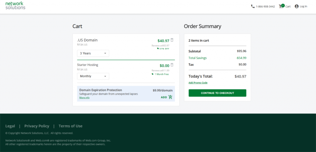 Network Solutions gives you a free domain name when you sign up for an annual hosting or website builder plan. The offer includes popular TLDs like .com, .net, and .org, and it’s applied automatically at checkout with eligible hosting services.