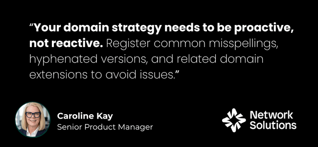 As our Senior Product Manager Caroline Kay puts it, “Your domain strategy needs to be proactive, not reactive. Register common misspellings, hyphenated versions, and related domain extensions to avoid issues.”
