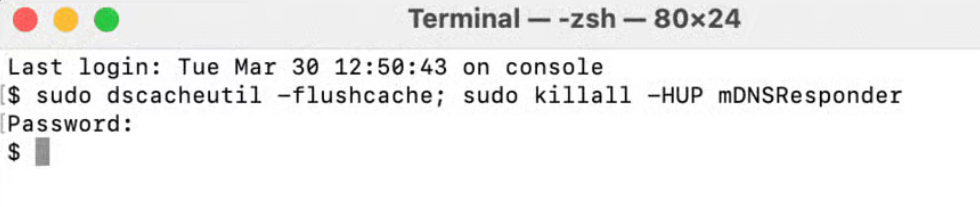 sudo dscacheutil -flushcache; sudo killall -HUP mDNSResponder - Enter your device password if prompted.