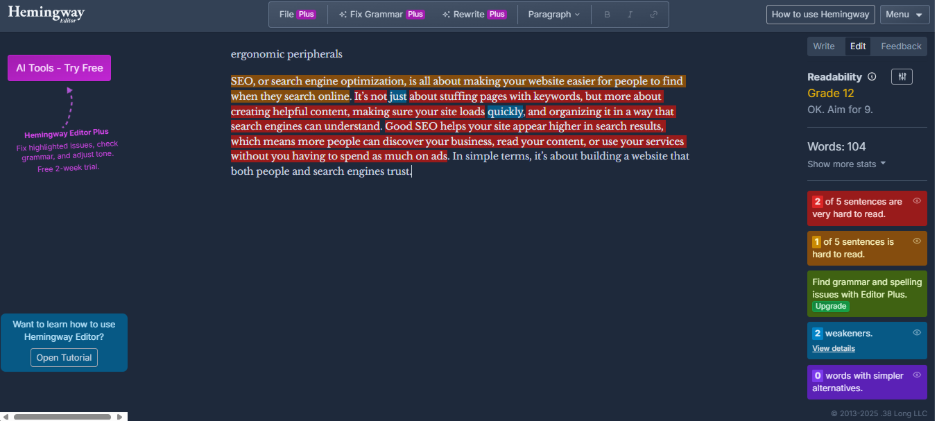Just like Grammarly, Hemingway Editor helps strengthen your SEO by improving how readable and clear your content is. It focuses on simplifying language, which keeps readers engaged and helps search engines better understand your pages.