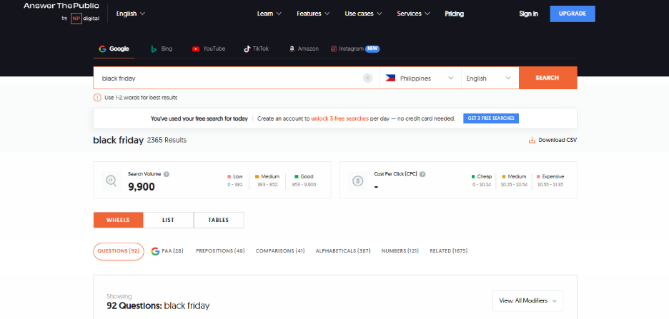 AnswerThePublic is a keyword and content idea tool that turns search queries into questions, comparisons, and phrases people actually type into Google.