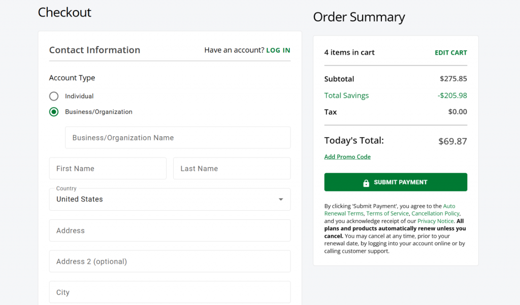 - Complete your registration details. Proceed to checkout; you’ll be prompted to provide your contact and billing information.