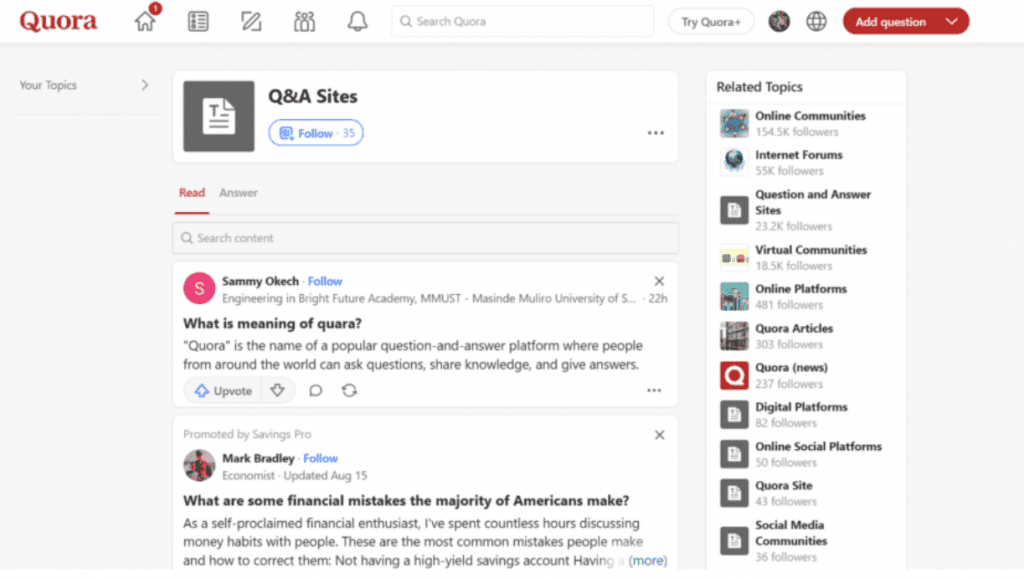 Quora Spaces are like Reddit’s subreddits. Each space brings together selected answers, posts, and discussions on a specific topic. They’re ideal for connecting with niche communities, staying informed about industry trends, and contributing your own insights.